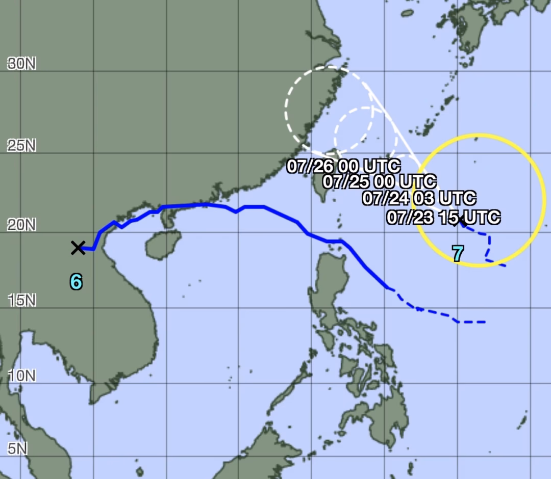 Một áp thấp nhiệt đới mới đã hình thành gần Biển Đông vào sáng ngày 23.7, chỉ ít lâu sau khi bão số 3 tan biến. Điều đáng chú ý là áp thấp nhiệt đới này có khả năng mạnh lên thành bão. Cùng lúc, một áp thấp nhiệt đới khác ở phía đông đã mạnh lên thành bão số 7 trên vùng biển tây bắc Thái Bình Dương.