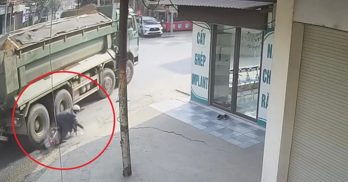 Trong một đoạn đường phố nhộn nhịp, một người đàn ông đi xe máy bất ngờ mất thăng bằng và ngã. Cùng lúc đó, một chiếc xe ben đang chuyển hướng phía sau đã cán qua bánh sau của xe máy. May mắn thay, người nạn nhân chỉ bị thương nhẹ và thoát chết một cách kỳ diệu.